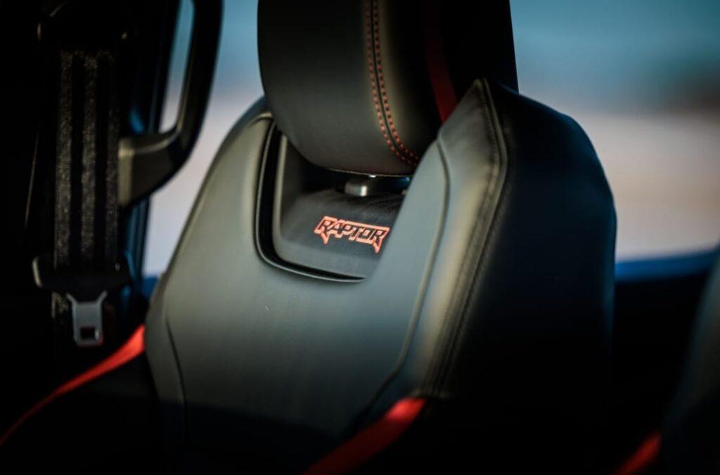 Por dentro há um novo volante exclusivo, menu “Raptor” com parâmetros de escapamento e modos de direção, borboletas atrás do volante em magnésio e revestimento preto e laranja enquanto os bancos são exclusivos com ajuste elétrico e apoio lateral. Todo o revestimento dos bancos é feito em couro e suede e o revestimento interno do teto e coluna são pretos.