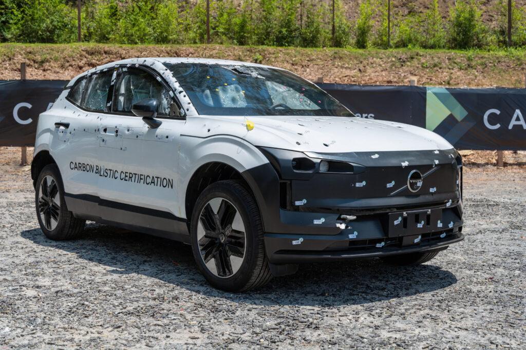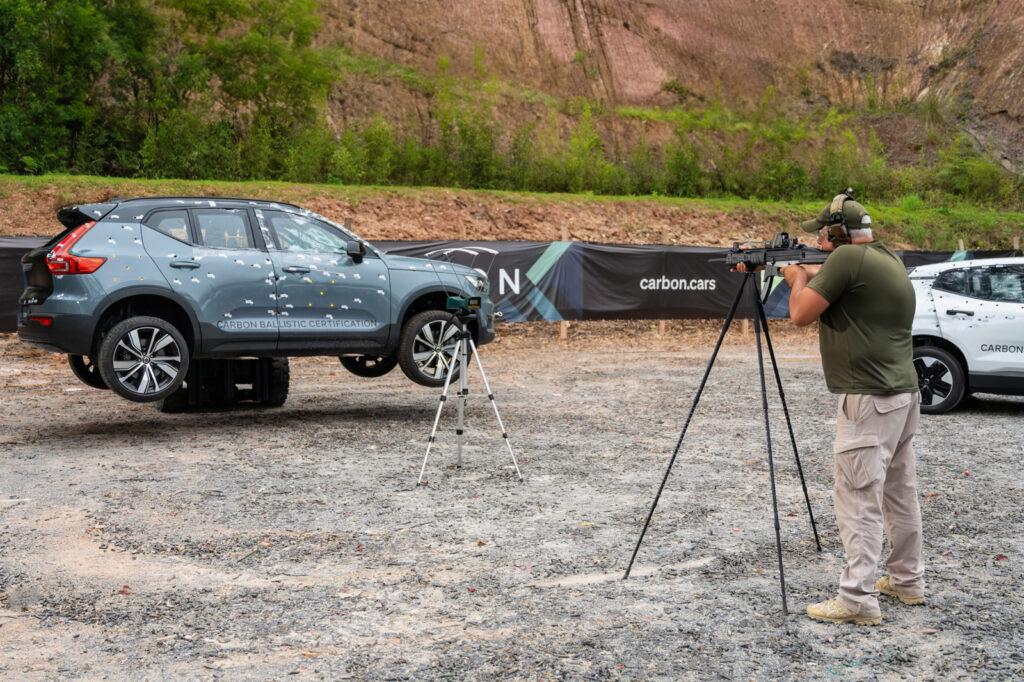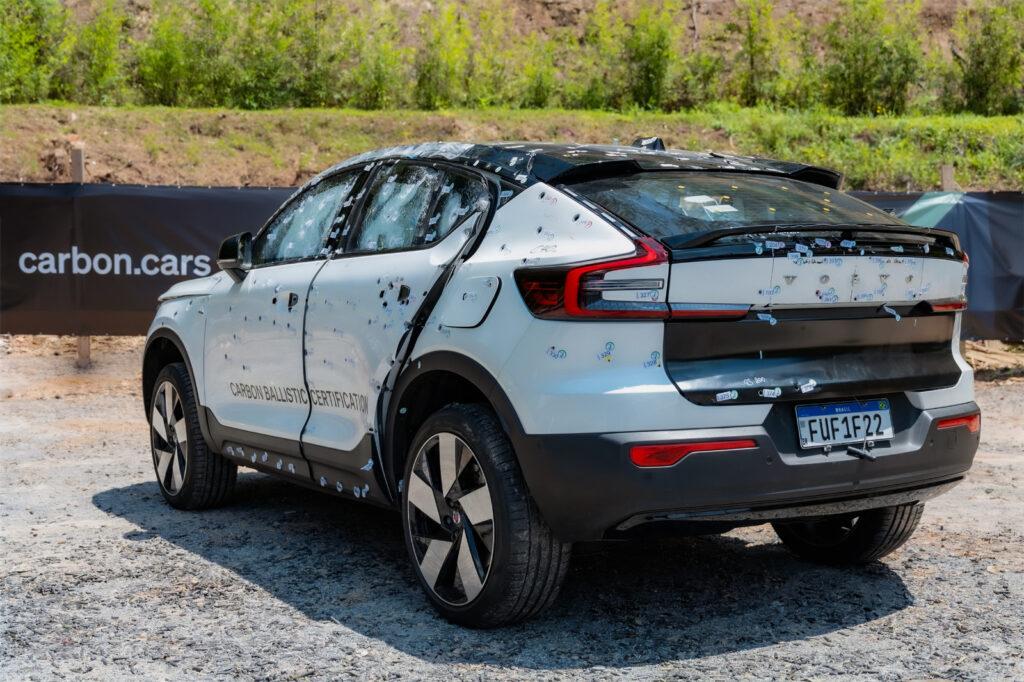 Para a avaliação dos modelos EX30, C40 e XC40, foram utilizados projéteis de 9mm e .44 disparados em ângulos de 90 e 45 graus relativos à blindagem, a uma distância de 5 metros do veículo.