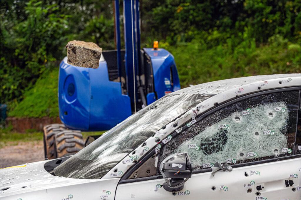 Os disparos são feitos por profissionais de elite contra o veículo em condições agressivas a uma distância de 5 metros. A ideia é simular uma situação de assalto no cotidiano.