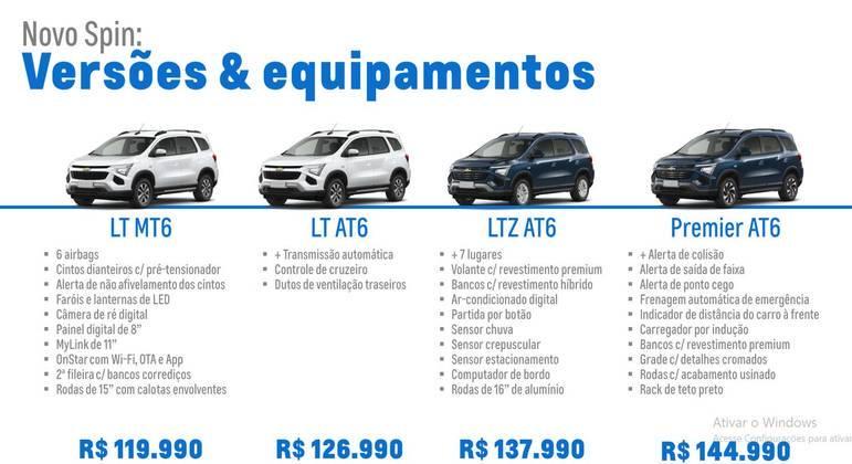 A nova Chevrolet Spin chegará aos mais de 600 concessionários da marca em quatro versões: LT MT6, LT AT6, LTZ AT6 e Premier AT6. Além disso, traz um novo visual alinhado com os novos produtos da marca, como Tracker e Montana, e irá manter o tradicional motor 1.8 litro flex de até 111 cv.