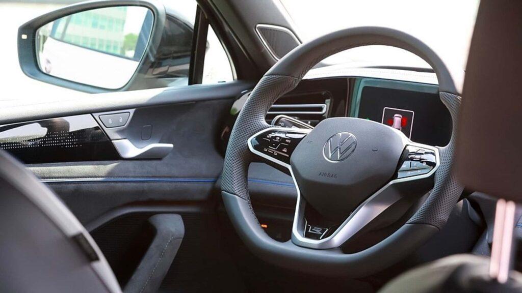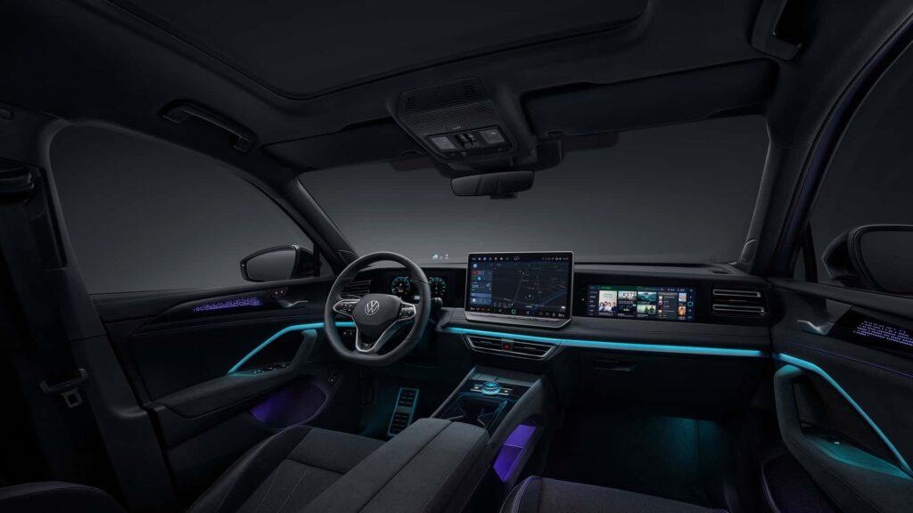Por dentro o perfil do Tiguan segue o mesmo porém com uma terceira tela de 11 polegadas, item que no mercado europeu não existe. O perfil de acabamento parece melhor e bem cuidado com uso de couro, alcântara e acabamentos metálicos no carro.