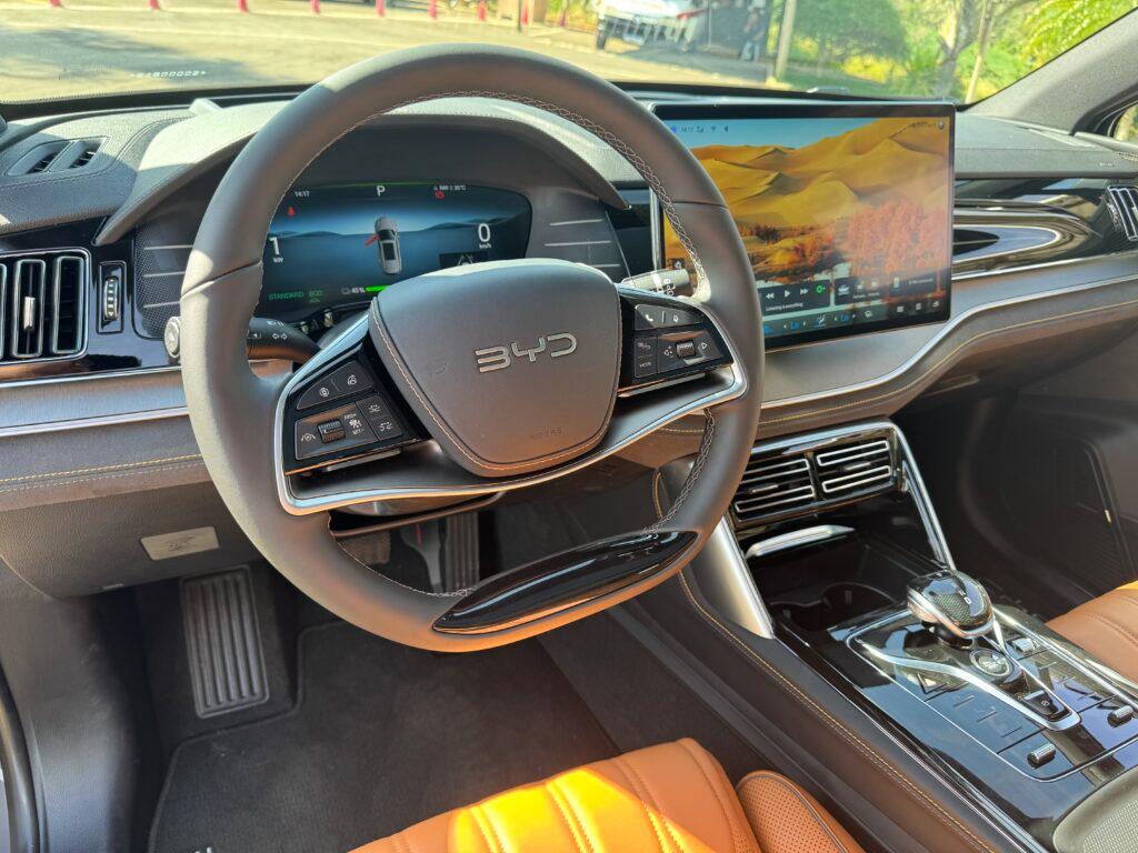 O BYD Tan agora oferece um head up display com informações de navegação, bancos com aquecimento e nada menos que 30 recursos ativos de segurança que atuam com 15 sensores, câmeras 360°, 7 airbags (antes eram 6) e também freios Brembo com disco ventilado e perfurado.