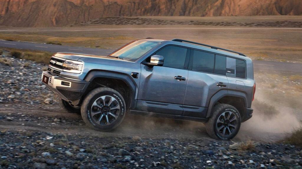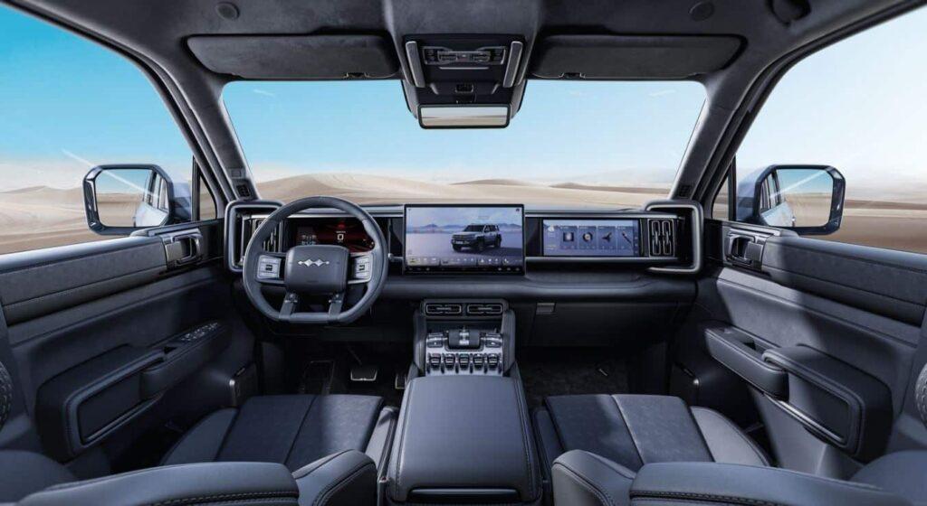Por dentro as linhas são bem "quadradas" para combinar com o estilo do carro mesclando conceitos de Defender e Mitsubishi com três telas sendo duas com 12,3 e outra central com 15 polegadas, tudo para controlar os sistemas de suspensão e aceleração além da gestão de energia e claro, o desempenho do Bao 5.