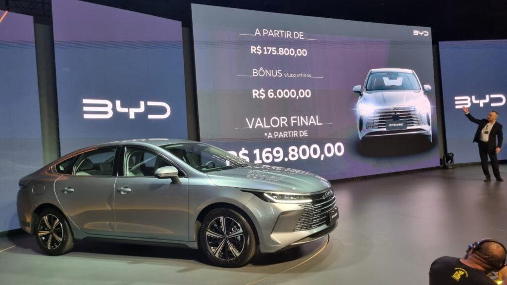A BYD estreia em mais um segmento estratégico para as marcas tradicionais. O sedã médio King foi apresentado hoje em São Paulo em duas versões com a clara intenção de disputar espaço com o líder do segmento Toyota Corolla. São duas versões onde o King é lançado com preço a partir de R$ 169.800 na GL versão de entrada e de R$ 181.800 na topo de linha GS. Todavia, esse preço conta com um bônus de R$ 6 mil até o dia 19 de junho. Após essa data o King GL custará R$ 175.800 e o GS sairá por R$ 187.800.