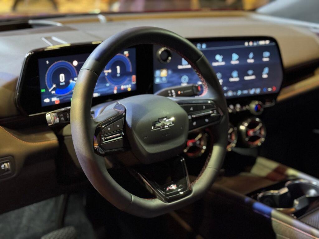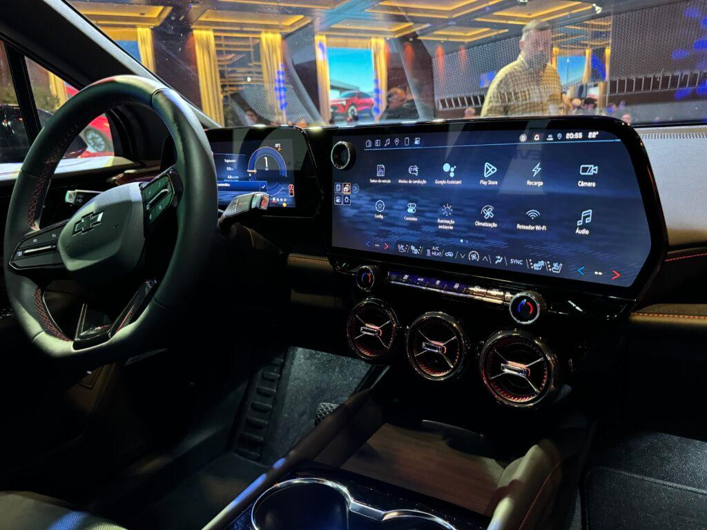 Por dentro, os bancos combinam suede e vinil, e o estilo dos difusores de ar é inspirado em turbinas (a parte central com três saídas é inspirada no Camaro). O painel conta com duas amplas telas: uma configurável de 11” e outra multimídia de 17,7”, com sistema OnStar, monitor de carga de bateria via aplicativo, Wi-Fi a bordo e atualizações remotas (over-the-air).