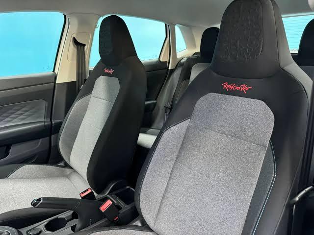 O painel tem aplique preto brilhante desde a lateral na maçaneta com emblema vermelho alusivo ao festival, bancos em tecido cinza, preto e com costura azul além da assinatura do da série e encosto de cabeça em baixo relevo.
