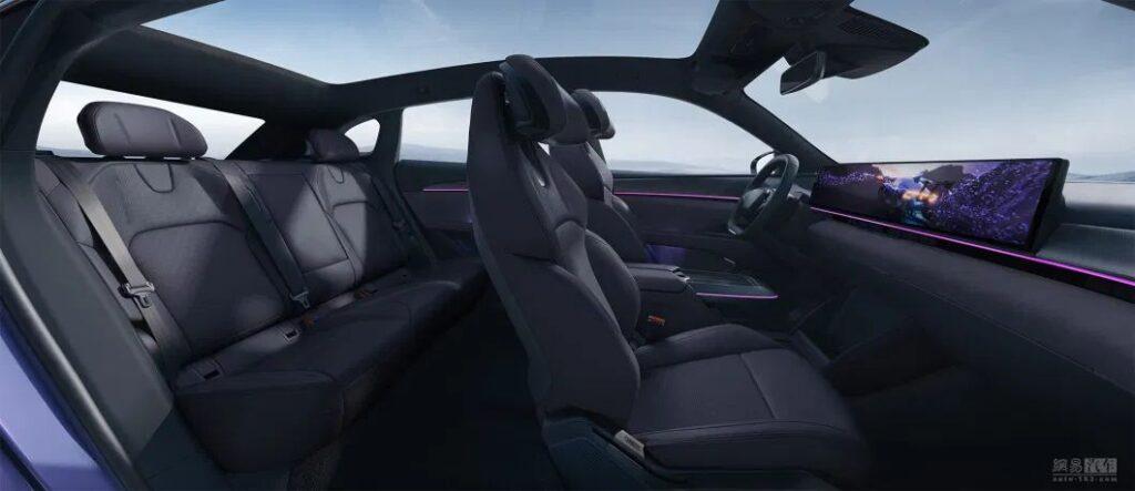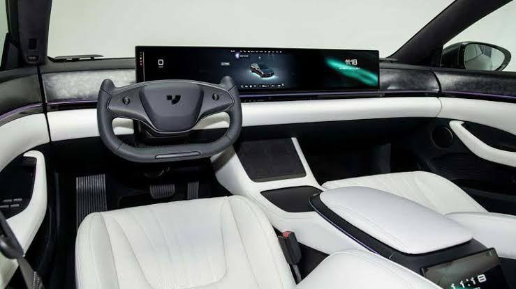 No interior, uma tela sensível ao toque de 35,6 polegadas domina o painel de perfil minimalista e futurista. Essa tela pode operar como uma unidade única ou ser virtualmente dividida em três segmentos. Outro destaque é o volante em estilo yoke. O sistema de navegação tem mapeamento em nível de faixa e o carro também conta com iluminação ambiente.