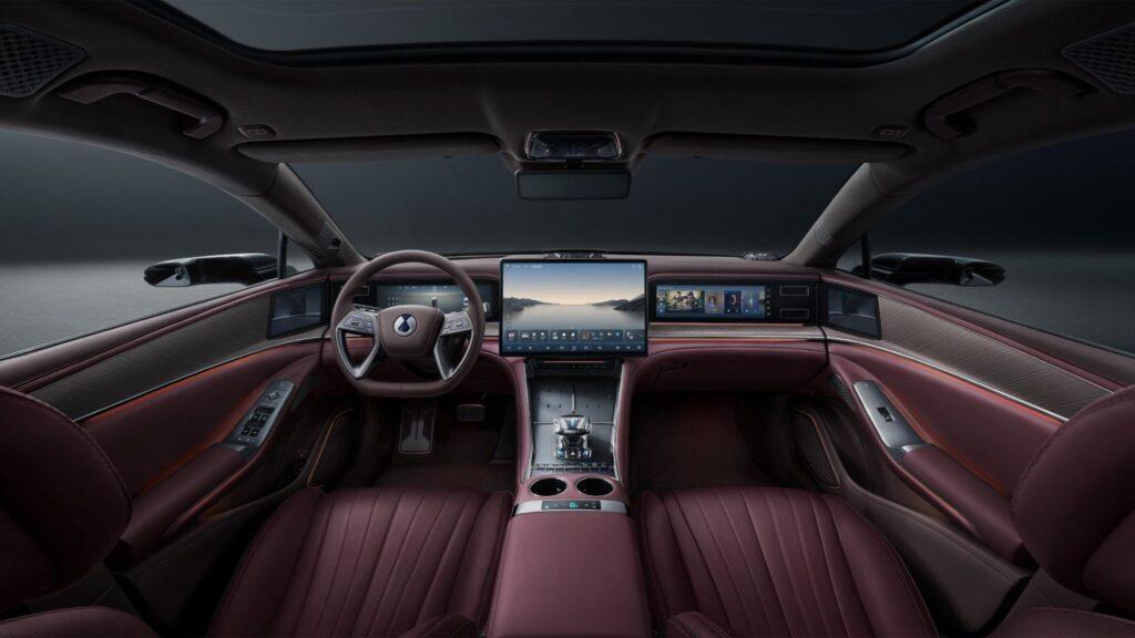 Por dentro, o Denza Z9 GT tem cinco assentos. O console central possui uma grande tela suspensa. Atrás do volante, há um painel de instrumentos digital. E há uma tela sensível ao toque para o passageiro dianteiro. O túnel central tem uma alavanca de câmbio retrátil de cristal e dois carregadores sem fio. O assento do passageiro dianteiro tem modo de gravidade zero e um suporte para as pernas com ajuste elétrico.