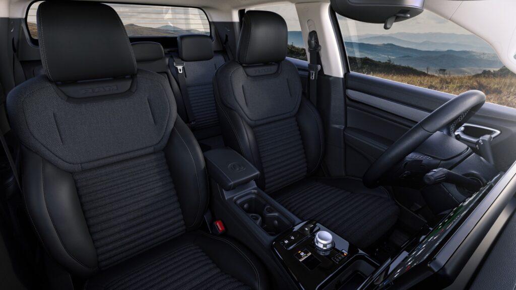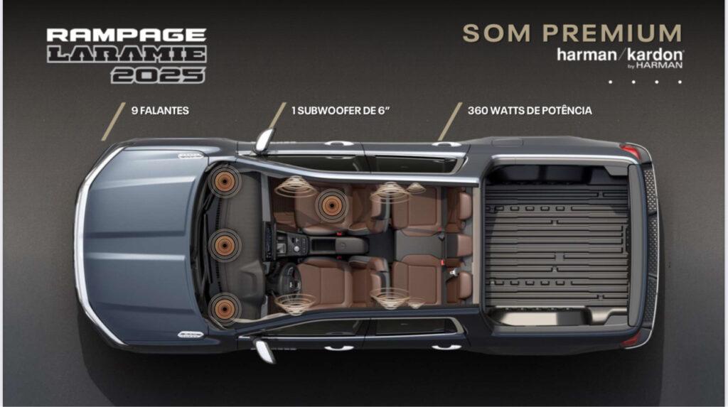 A Laramie ganha capota marítima de série, Som Harman Kardon com 360 watts com 9 alto falantes, Banco elétrico para o passageiro, Luzes ambientes de LED e Luz de cortesia com projeção do logo RAM no chão a partir do retrovisor.