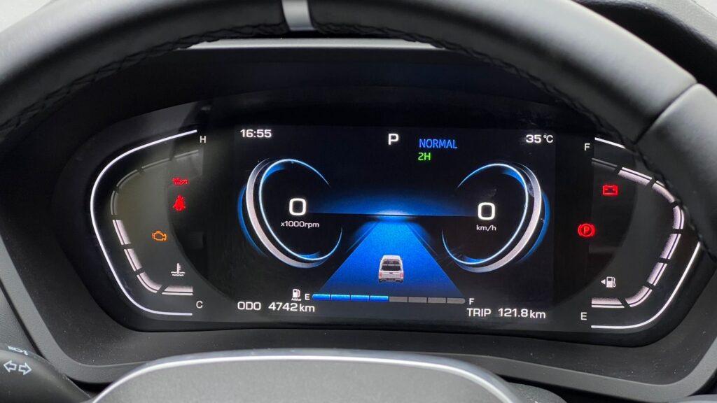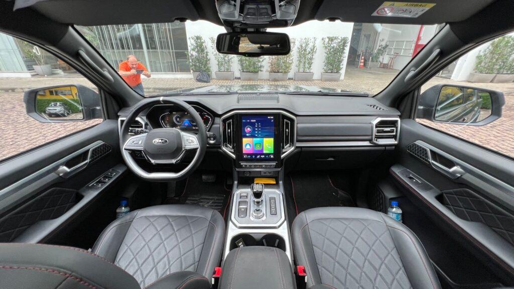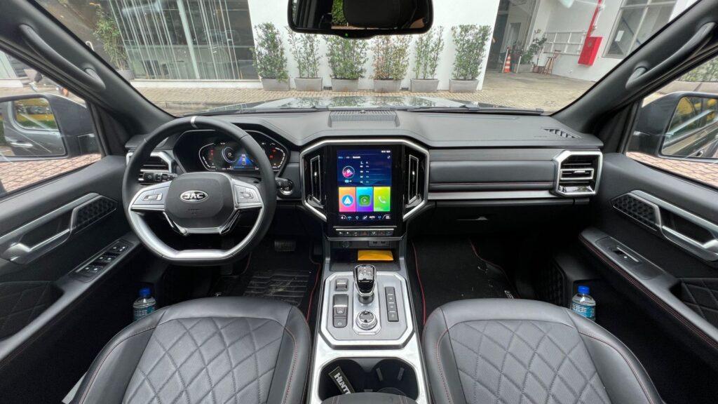 Ao primeiro olhar, a JAC Hunter impressiona e muito pelo porte ativo. Também causar uma boa impressão à sua montagem e o acabamento que mescla partes em plástico, soft touch e bancos em couro sem dever nada para uma picape tradicional. Fator que chama bastante atenção interna é a central multimídia de 13 polegadas vertical com conectividade aos sistema Android Auto e Apple CarPlay, mas apenas via cabo USB do tipo A.