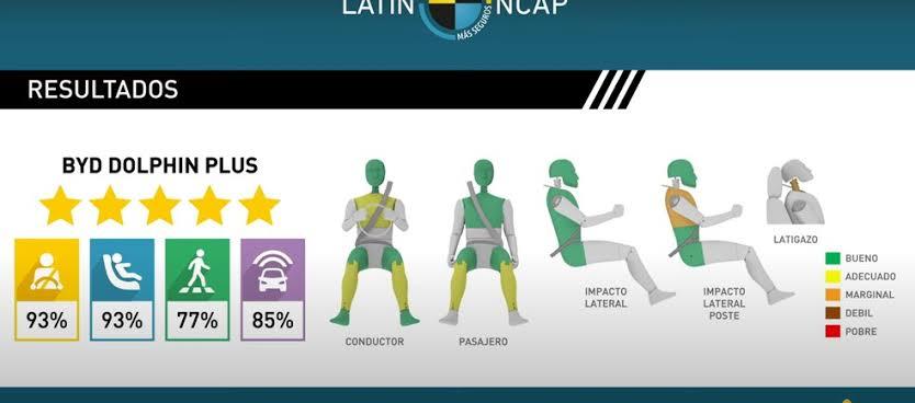 O Dolphin Plus que é produzido na China oferece 7 airbags, Controle Eletrônico de Estabilidade (ESC) e Sistemas Avançados de Assistência ao Condutor(ADAS) como equipamento padrão, obteve 92,60% para Ocupante Adulto, 93,17% para Ocupante Infantil, 77,03% para Proteção de Pedestres e Usuários Vulneráveis da Estrada e 85,17% para Assistência à Segurança.