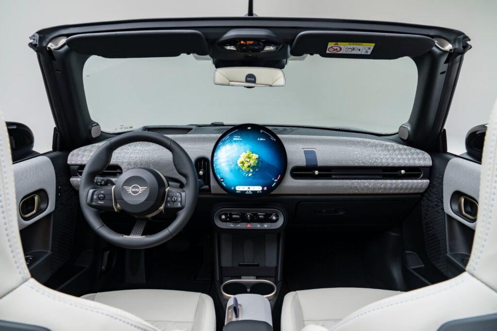 A central multimídia tem tela OLED de 240 mm de diâmetro, visível mesmo sob luz solar intensa, compatível com Apple CarPlay e Android Auto sem fio. O sistema operacional MINI Operating System 9 permite controle por toque ou assistente de voz, além de animações interativas. O sistema de som Harman-Kardon inclui 12 alto-falantes e 365W de potência.