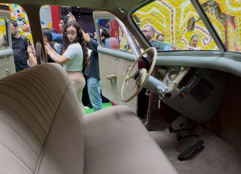 O interior do carro feito com revestimento felpudo em bege claro mostra o conceito de amplo espaço com portas invertidas na traseira (suicidas) e diminuto painel com velocímetro e instrumentação.