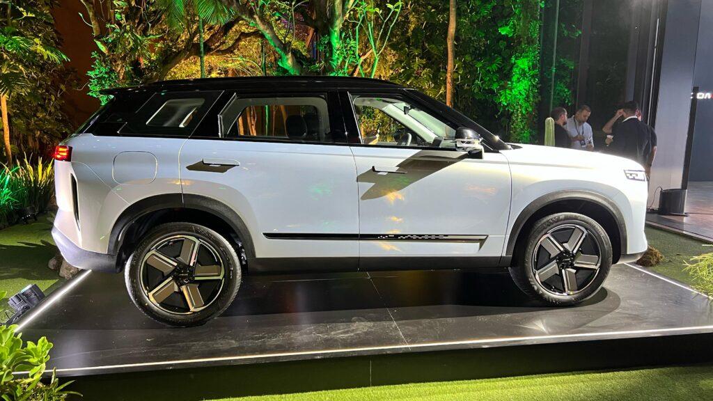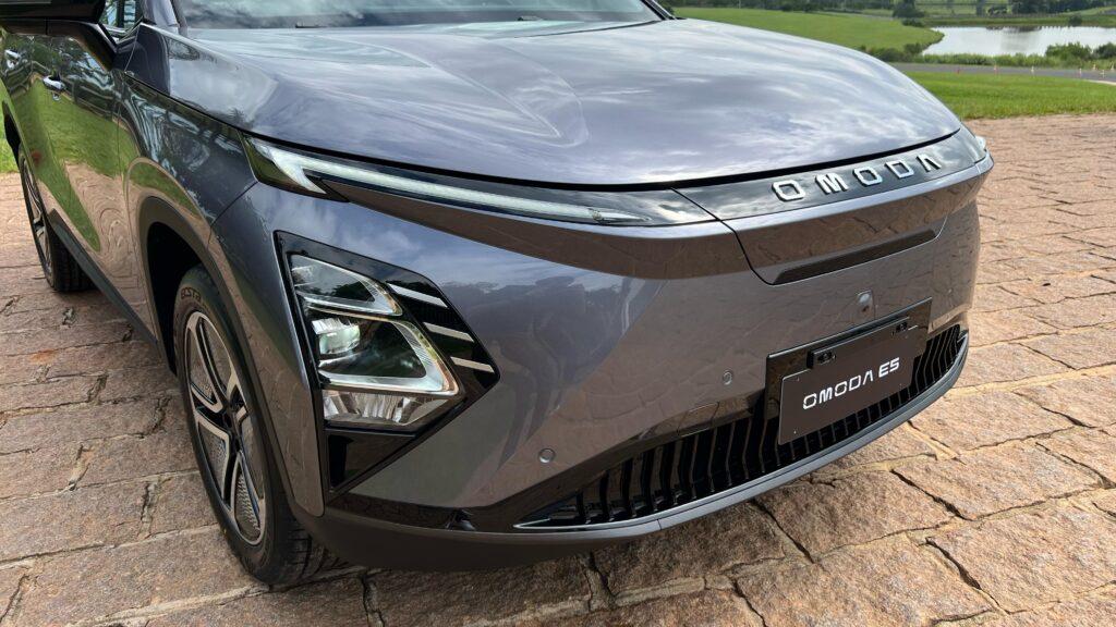 No visual o Omoda E5, veículo 100% elétrico, conta com aerofólio duplo, rodas aro 18 polegadas com acabamento aerodinâmico e o design dos faróis são o destaque.