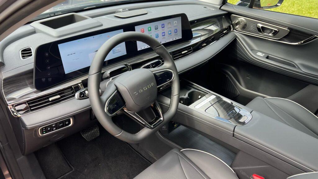 No interior, a tela multimídia vertical de 14,8 polegadas traz reconhecimento facial, atualizações over-the-air e, conectividade Apple CarPlay e Android Auto sem fio.