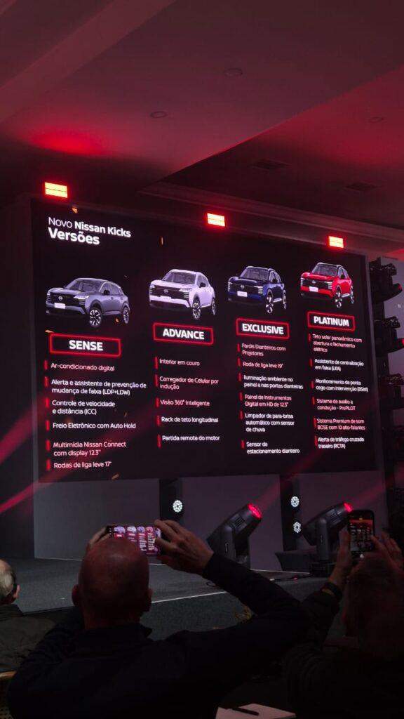O novo Nissan Kicks 2026 está disponível em quatro versões: Sense, Advance, Exclusive e Platinum repetindo a estratégia de nomenclatura já usada na geração anterior que segue disponível como "Kicks Play".
