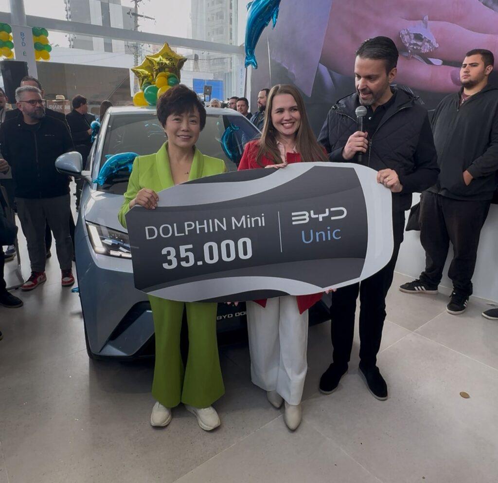 O Dolphin Mini é líder de vendas no segmento de elétricos no mercado brasileiro. Para marcar o feito de 35 mil unidades comercializadas, a BYD fez uma cerimônia de entrega do veículo para Maria Rocha de Oliveira, empresária paulista de 28 anos. As chaves foram entregues por Stella Li, vice-presidente executiva da BYD , na inauguração da concessionária Uniq em São Paulo, que é a 183ª unidade da marca no país.