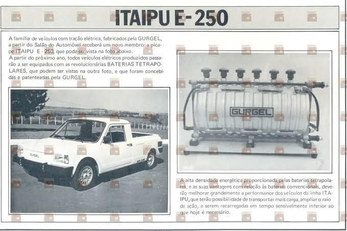Em 1975 surgiu o Gurgel Itaipu E250, que era uma proposta comercial de olho em uma demanda criada pela Eletrobras para que empresas comprassem carros elétricos.