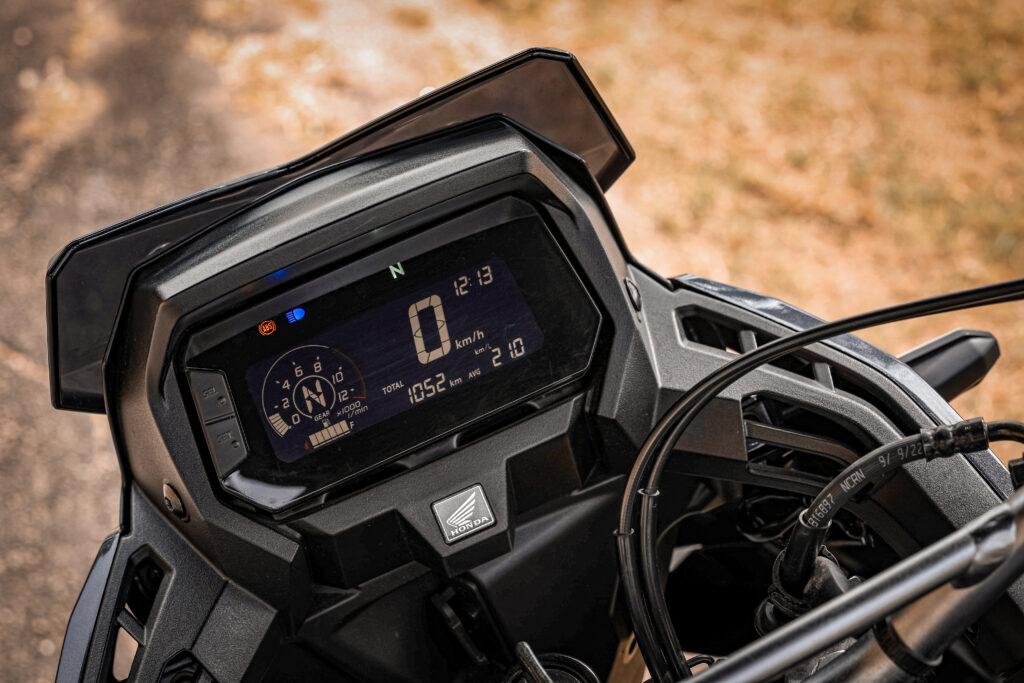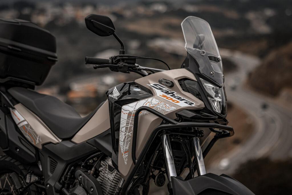 Entre os itens de série, a Sahara traz painel digital LCD Blackout com indicador de marchas, iluminação full-LED, tomada USB-C e sistema de frenagem de emergência (ESS). A versão Adventure inclui para-brisa mais alto, protetor de carenagens e proteção de cárter como equipamentos de fábrica — opcionais nas demais versões.