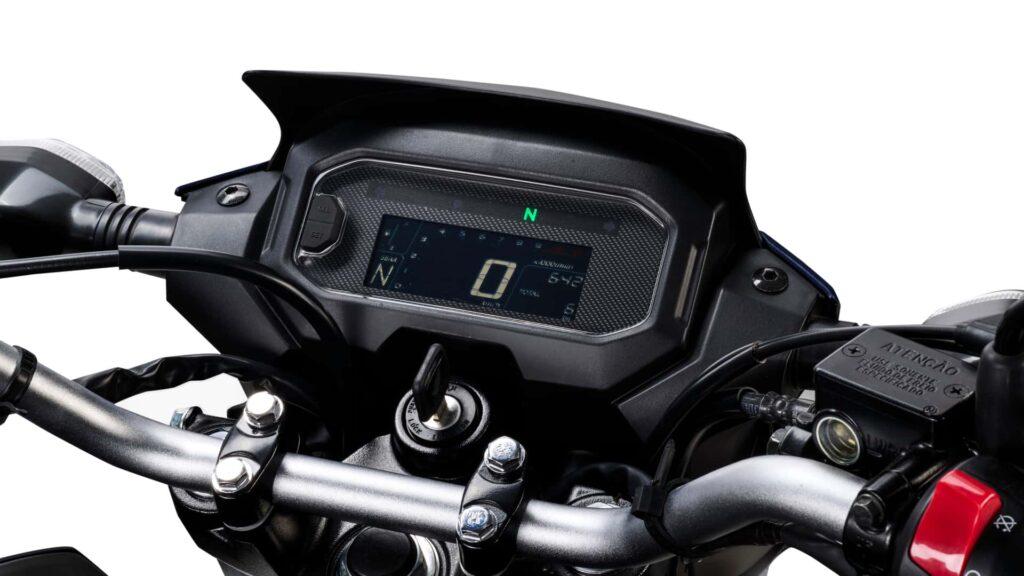 Entre elas estão farol e lanterna em LED, painel digital com indicador de marcha, conta-giros e consumo médio, tomada USB-C na carenagem do farol, assento em dois níveis e ergonomia revista, com guidão reposicionado. O tanque metálico de 12 litros segue com proteções plásticas e bagageiro integrado.