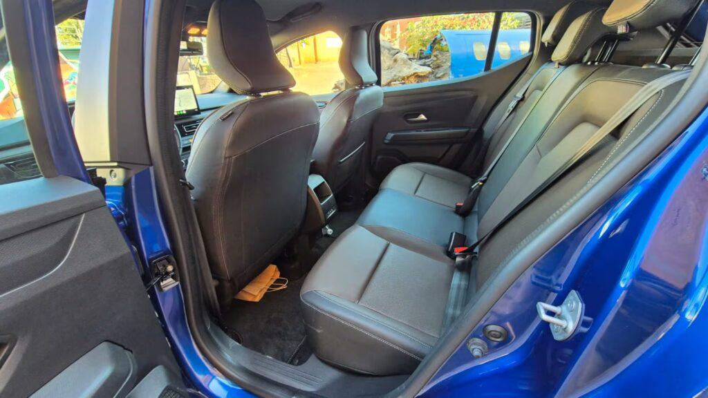 O interior conta com bancos em material têxtil na cor marrom, com pespontos claros, que se estendem às laterais de porta e painel. A versão Techno adiciona revestimento premium em painéis e volante, enquanto a Iconic inclui ainda o Ambient Lighting de série.