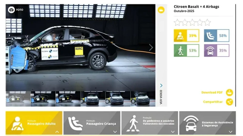 "A Stellantis reforça seu compromisso com a Segurança Veicular e que todos os modelos comercializados atendem as regulamentações nacionais e internacionais vigentes nos países da América Latina e Europa. Todos os veículos Stellantis comercializados na América do Sul passam por rigorosos protocolos de avaliação realizados no Safety Center, localizado em Betim/MG, o mais moderno centro de testes de colisão do hemisfério sul, que garantem as certificações legais e técnicas necessárias para todos os projetos desenvolvidos pelas marcas da companhia.Vale ressaltar que a segurança de um veículo é um conjunto concebido desde o início do seu desenvolvimento e vai muito além da oferta individual de itens de segurança ativa e passiva. Além disso, a variante da plataforma CMP permite que toda a gama Citroën tenha uma carroceria com ampla proteção ao habitáculo. Dos requisitos exigidos pela regulamentação brasileira e também pelas regulamentações globais, para citar os mais relevantes, o Citroën Basalt conta com estrutura robusta, carroceria com aço de alta e ultra resistência, arquitetura com máxima proteção contra choques, testes de colisão aptos e segurança passiva sólida. Informamos, ainda, que a empresa não financia nem patrocina as avaliações realizadas pela entidade."