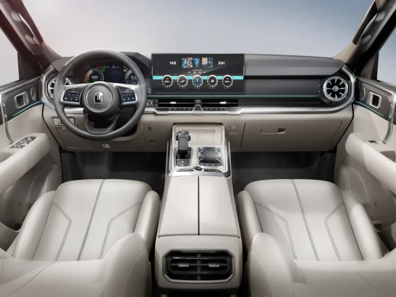 Nas versões superiores, o Tank 400 oferece bancos dianteiros com aquecimento, ventilação e massagem, tela de 15,6” para os passageiros traseiros, geladeira de 5,4 litros, cortinas manuais e sistema de som com 14 alto-falantes.