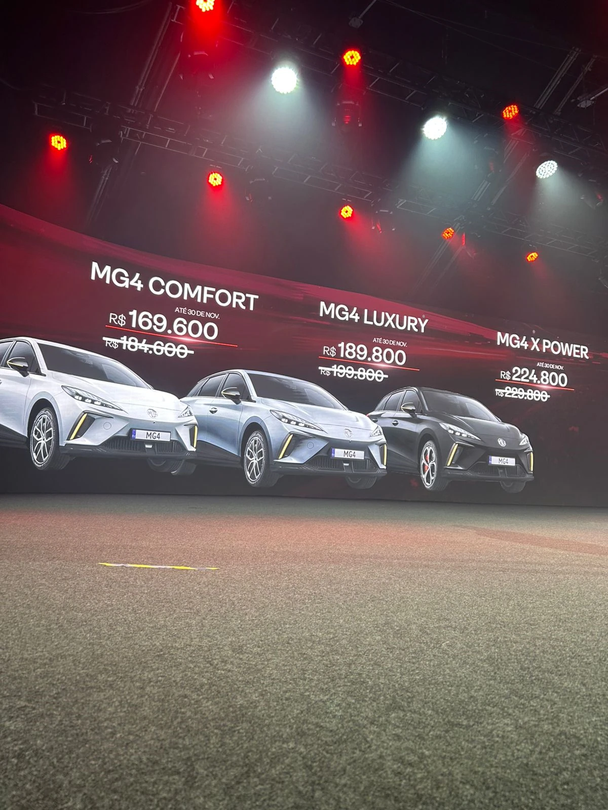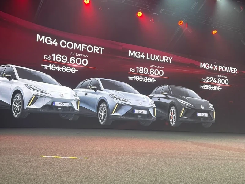 A MG Motors apresentou no Salão do Automóvel de São Paulo os modelos elétricos MG4, MG S5 e MG Cyberster. O MG4 será comercializado nas versões Comfort por R$ 169.600, Luxury por R$ 189.800 e Power por R$ 224.800, com valores válidos até 30 de novembro. O AutoShow está no salão do automóvel que acontece entre 22 e 28 de novembro no distrito Anhembi.