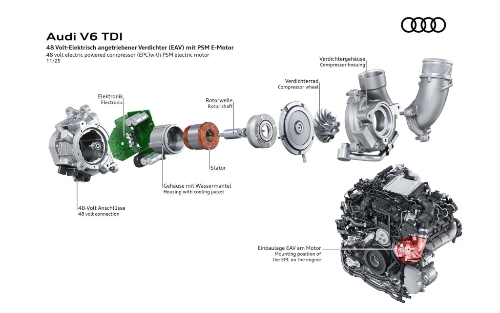 A Audi anunciou uma nova versão do motor V6 3.0 TDI para os modelos Audi Q5 e Audi A6 na Europa — agora equipada com tecnologia híbrida leve (MHEV plus) e compressor elétrico. O conjunto oferece 299 cv (220 kW) e 580 Nm de torque, com apoio elétrico de até 24 cv e 230 Nm, melhorando respostas em baixas rotações e reduzindo o “turbo lag”. Ainda não se pode afirmar que o Q5 e A6 serão lançados no Brasil.