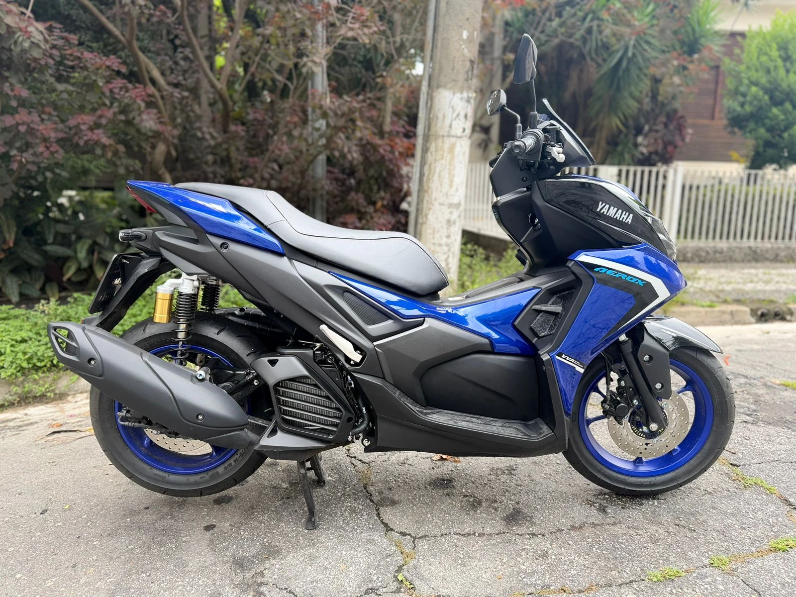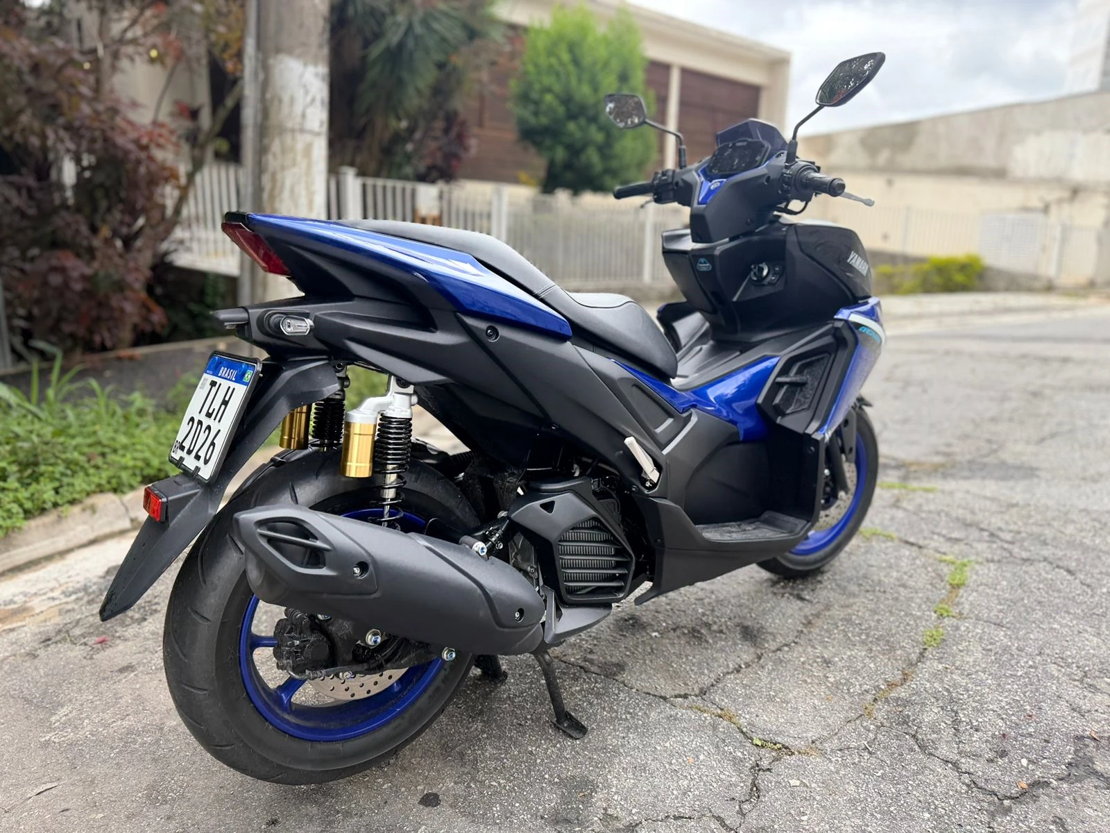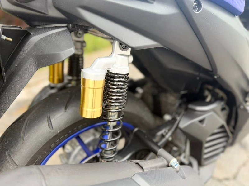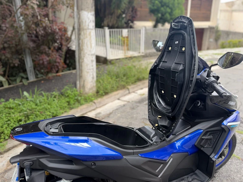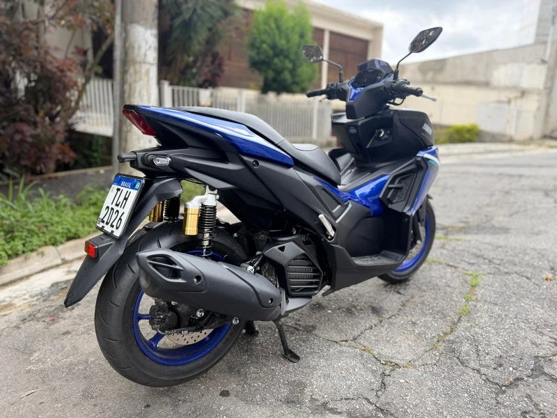 Na suspensão, a Aerox traz garfo telescópico dianteiro com 100 mm de curso e conjunto traseiro com 86 mm e Subtank duplo, solução que melhora o controle em pisos irregulares. Os freios são a disco nas duas rodas (230 mm), com ABS atuando na dianteira. Os pneus 110/80-14 na frente e 140/70-14 atrás — o mais largo da categoria — contribuem para a estabilidade.