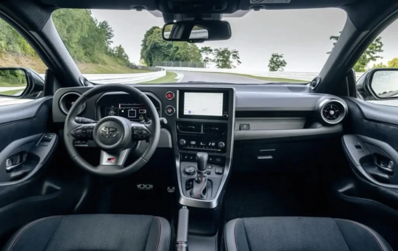 Nas imagens divulgadas pela marca o GR Yaris tem o painel com uma ampla moldura e porção central voltada ao motorista incluindo console, câmbio e multimídia na versão automática. A versão manual tem o painel mais tradicional com moldura arredondada sobre os instrumentos e multimídia flutuante.
