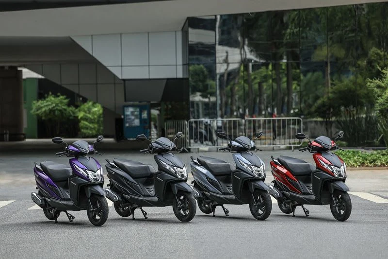 A Honda Elite 125 2027 será vendida em quatro cores: Roxo Fosco (Mat Midnight Purple), Cinza Metálico (Mat Cynos Gray Metallic), Cinza Perolizado (Pearl Stark Gray) e Vermelho Metálico (Pearl Royalty Red).