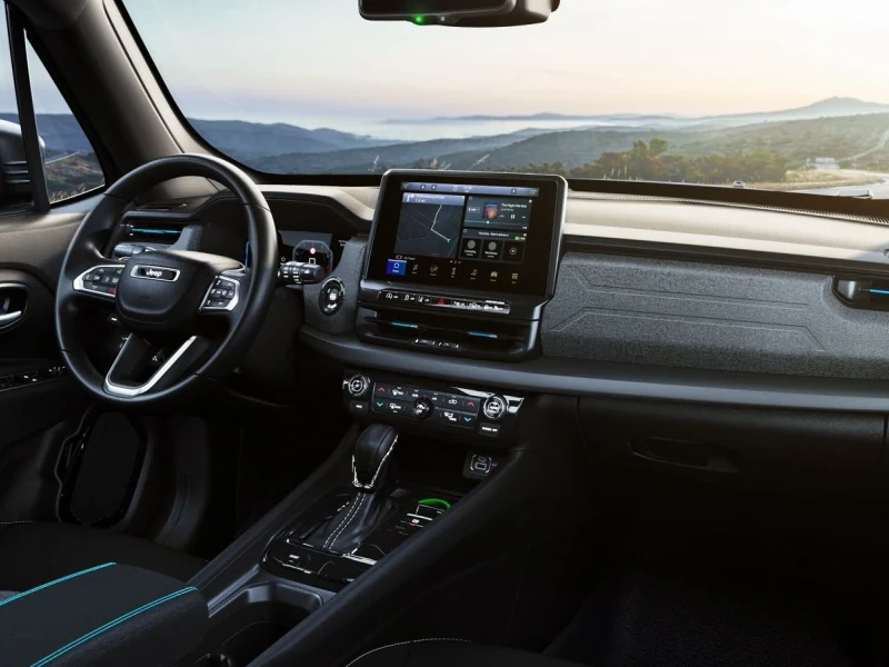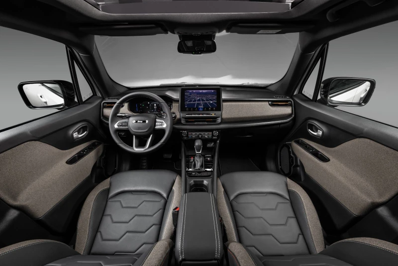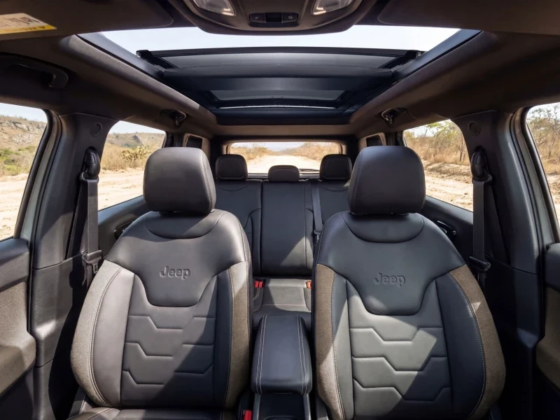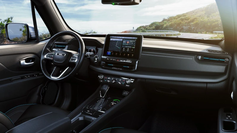 O interior é minimalista e recebe a maior mudança já vista no Renegade. O tabelier é mais retilíneo, com peças mais uniformes e “quadradas”. O console central recebe nova alavanca menor (igual a da Toro), nova multimídia flutuante e mais conectividade a bordo além de saídas de ar para o banco traseiro. Há 10% mais porta objetos e índice de reciclabilidade de 82% e recuperabilidade de 85%.