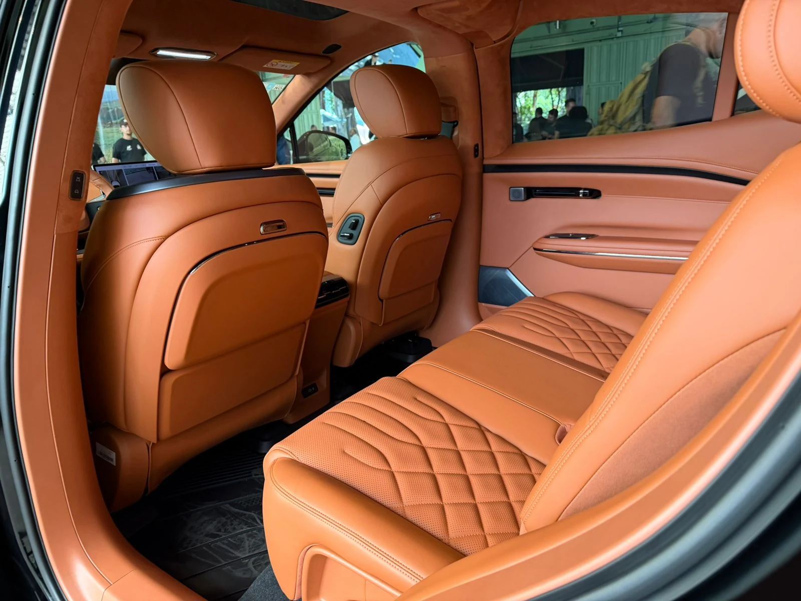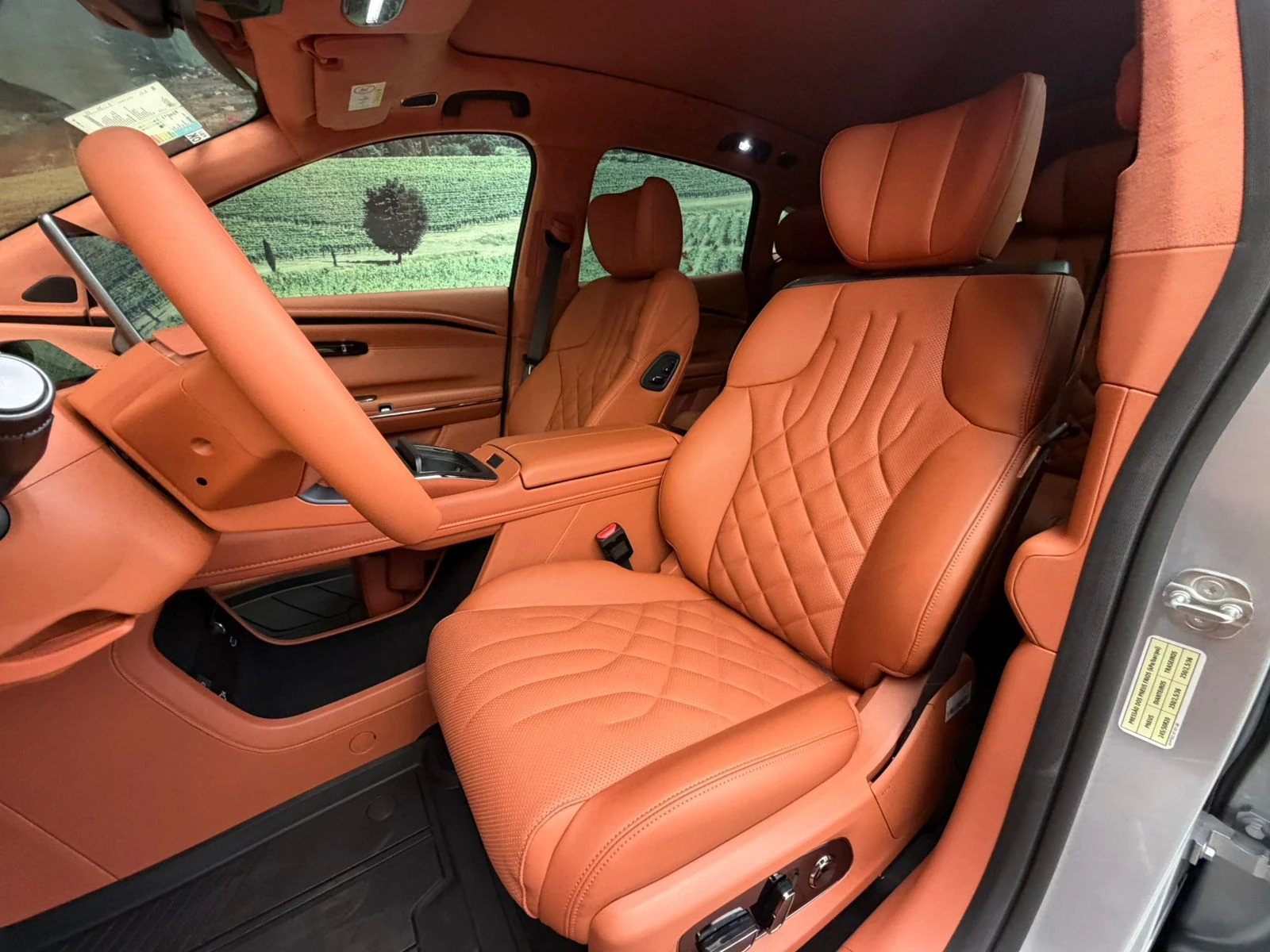 O acabamento utiliza couro Nappa e oferece ampla gama de ajustes elétricos. O banco do motorista conta com regulagens elétricas e pneumáticas com memória, enquanto o passageiro também dispõe de múltiplos ajustes elétricos. Há ventilação, aquecimento e função de massagem nos bancos dianteiros. Na traseira, o encosto reclinável chega a 143°.
