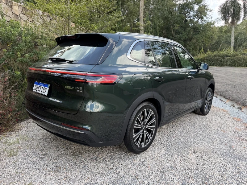 O EX5 EM-i é o terceiro produto da Geely no mercado nacional e mantém o mesmo visual da versão 100% elétrica, com linhas limpas e coeficiente aerodinâmico de 0,28. As diferenças ficam concentradas nas rodas e na grade inferior aberta, necessária para a refrigeração do motor a combustão.